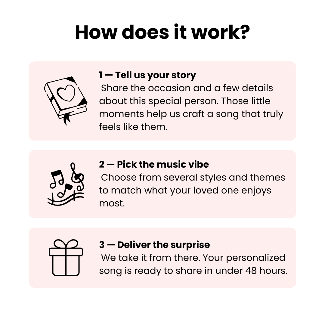 Tell us what makes your story unique – and we’ll turn it into a song that captures every emotion.